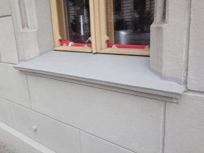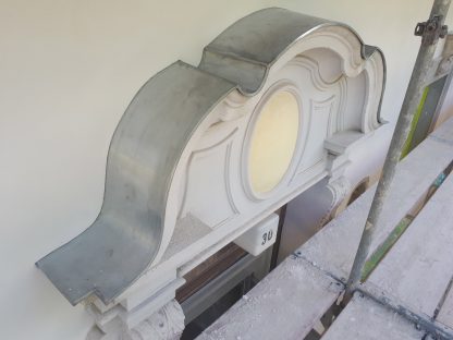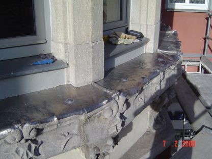 Der Schutz der Putzflächen und der Stuckaturen vor Niederschlagswasser ist entscheidend für die Lebensdauer der Fassaden. Die fachgerechte Anordnung der Dehner, Vorstoßbleche und Anschlüsse sind genauso entscheidend wie schmale filigrane Abkantungen. Oft werden die Fassadenbleche auch gestrichen und gesandelt, analog einer 170 Jahre alten Technik. Aus unserer Erfahrung von über 150 Fassaden ist es immer sinnvoller alle Vorsprünge grösser 4cm fachgerecht zu belegen, mit Zink, Kupfer oder Blei.